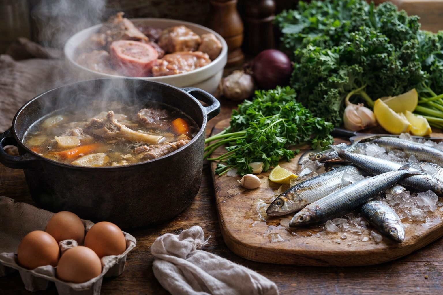 À l’inverse, les poissons entiers, les têtes, les arêtes, la peau ou certaines préparations mijotées permettent de mieux valoriser les tissus riches en collagène.