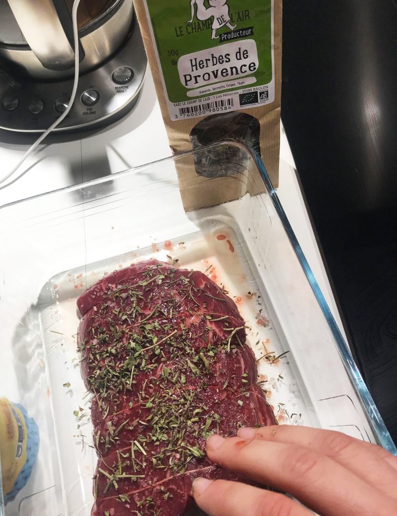 - Je parsème d’herbes de provence (achetées au magasin de producteurs Brin d’Herbe de Chantepie) de chaque côté du morceau. Libre à chacun d’assaisonner de la manière dont il souhaite.