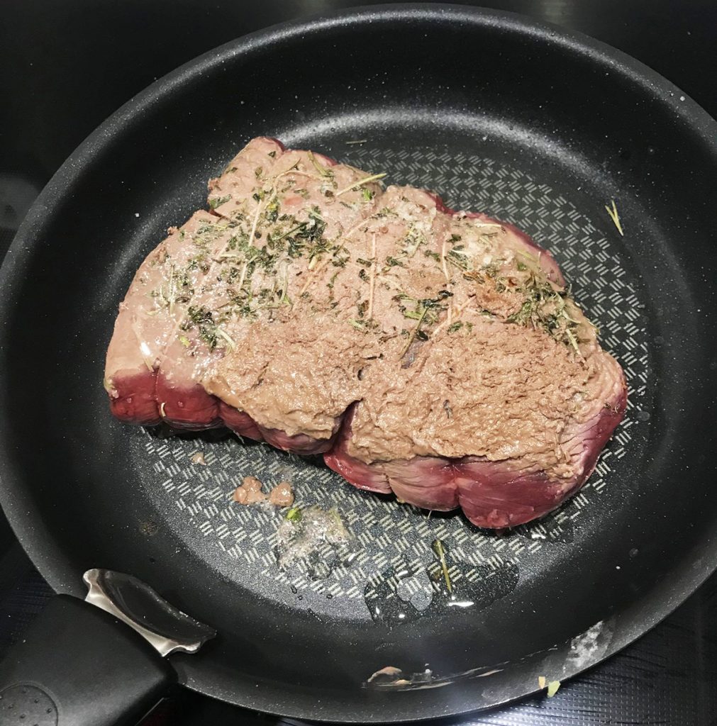 - Je dispose le rosbeeff dans la poêle chaude afin qu’une croûte se forme de chaque côté (ceci évite au jus de quitter la viande durant la cuisson).
