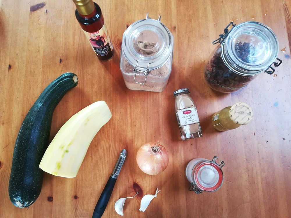 Couper les courgettes en dés, émincer l’oignon et l’ail et les placer dans un grand fait-tout. Ajouter les raisins secs, le sucre et les épices puis mélanger.