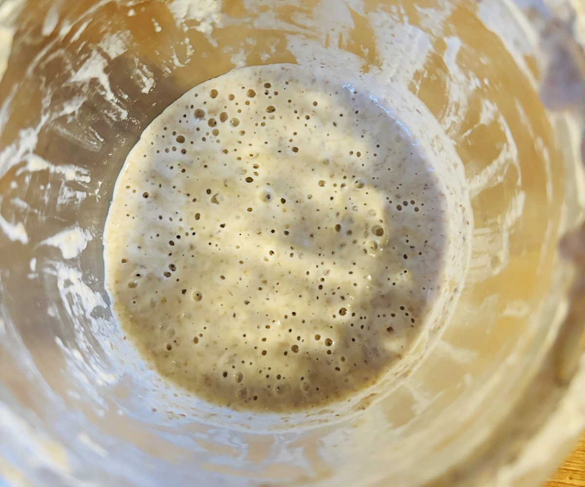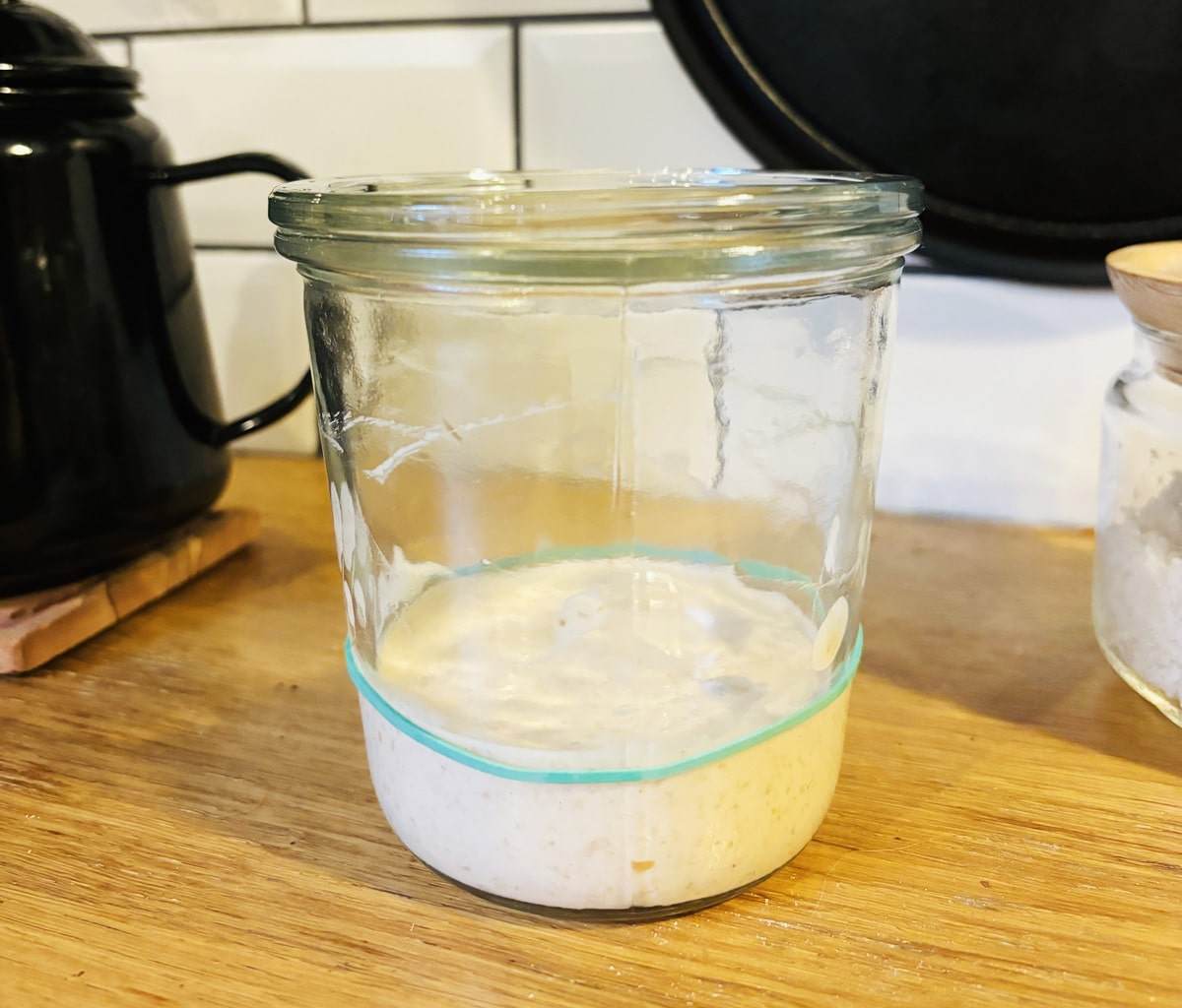 Prélève 100 grammes de levain, ajoute 50 g de farine et 50 g d’eau. Laisse reposer 24 heures.