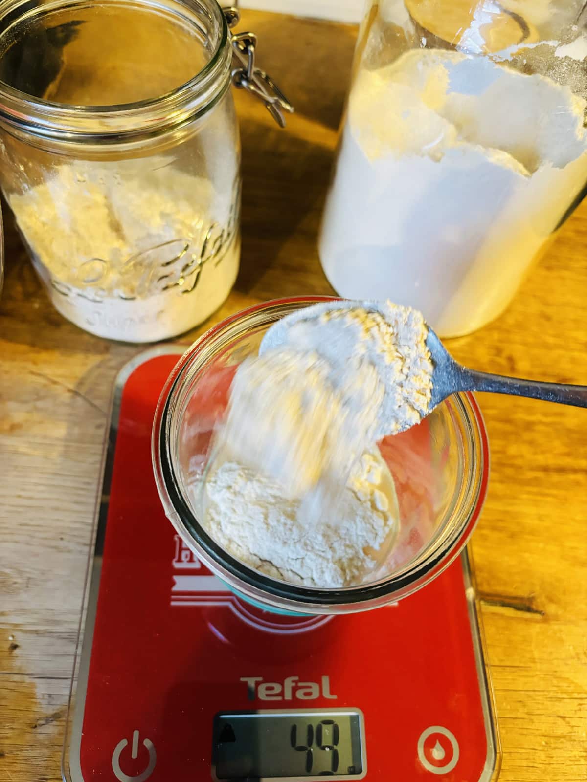 À chaque prélèvement, pèse le levain restant et ajoute l’équivalent de son poids avec 50 % d’eau et 50 % de farine.