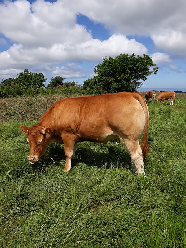 Ses bovins sont élevés sur une ferme de 80 hectares sur le principe de l’agriculture raisonnée. Il y a 30 vaches de race Limousine et la suite, toutes nées sur l’exploitation. Elles sont en pâtures au minimum 8 mois de l’année et, en hiver, elles ne reçoivent que des aliments de la ferme : foin, betterave et maïs.