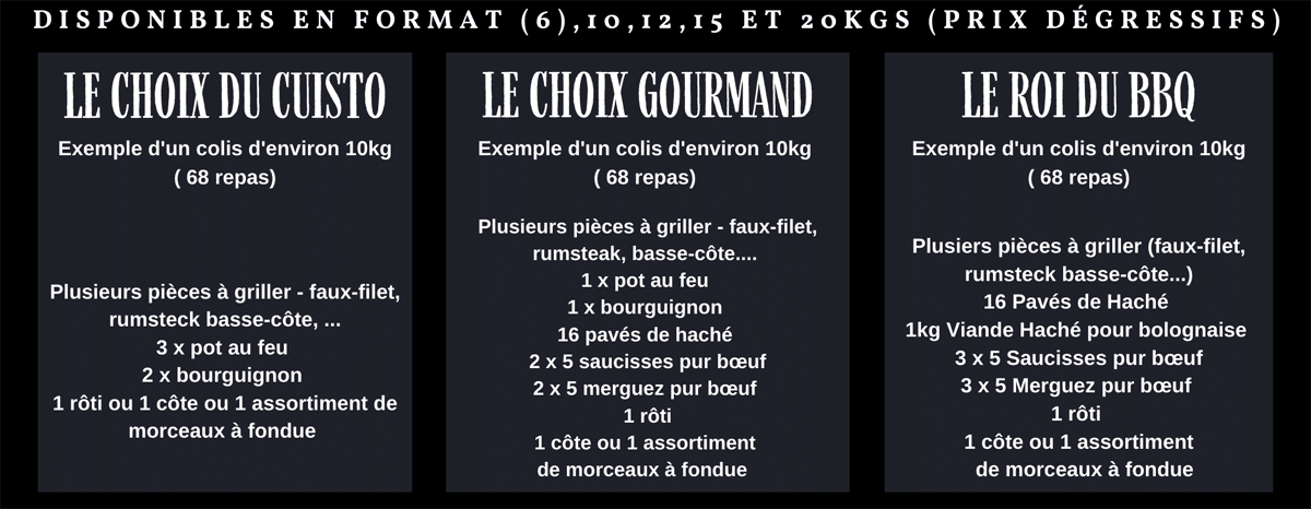 Le bœuf est disponible en caissettes de six et dix kilos. Également en douze, quinze et même vingt kilos.