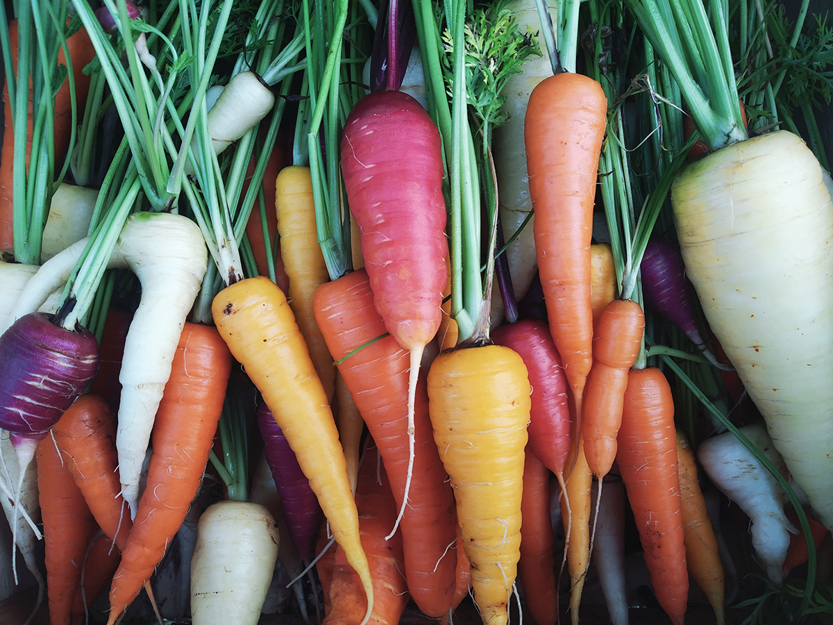 Nos outils sont simples et n’utilisent pas d’énergie fossile. Nous nourrissons le sol avec des fumures provenant de la ferme ou de celles voisines, idem pour le paillage (foin, paille ou broyat de branches. Nous associons et densifions les cultures du fait de notre petite superficie (2500m2). Cela donne des légumes uniques au calibre parfois plus petit ou irrégulier que ce que l’on peut trouver en supermarché. Mais cela plaît à nos client.es. L’étal du marché est souvent assez attrayant par ses couleurs et ses variétés étonnantes.